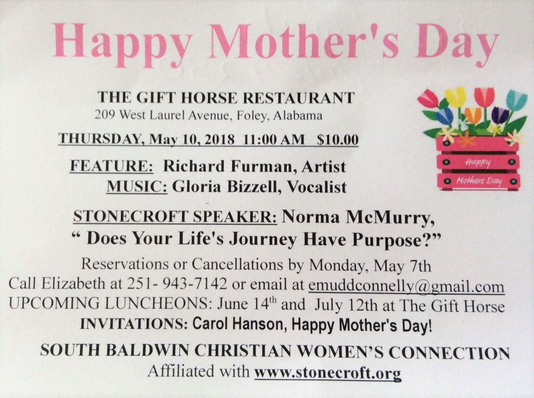 Thursday, May 10, 2018 - 11:00am to 2:00pmhttps://www.facebook.com/South-Baldwin-Christian-Womens-Outreach-and-Pra… At: Gift Horse Restaurant http://www.thegifthorserestaurantandantiques.com/ 209 W. Laurel Ave, Foley, AL, 36535(251) 943-3663